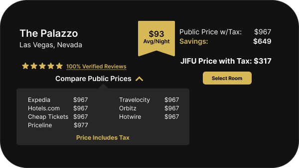 It’s simple, we get access to the same travel inventory from the same place with the same prices. To make a profit and pay for advertising, other “discount” travel sites mark the prices up. At JIFU, we take those savings and pass them directly on to you, our members.